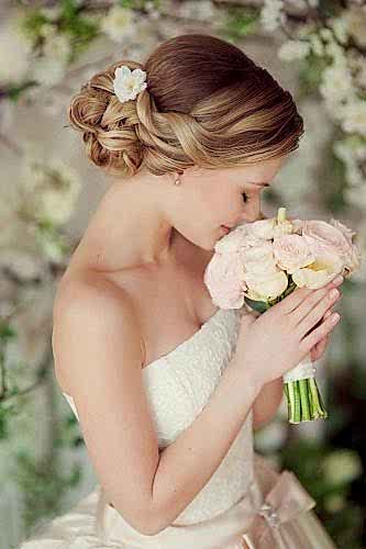- Низкий Pin Up на основе легких локонов, прическа на свадьбу с элементами плетения.